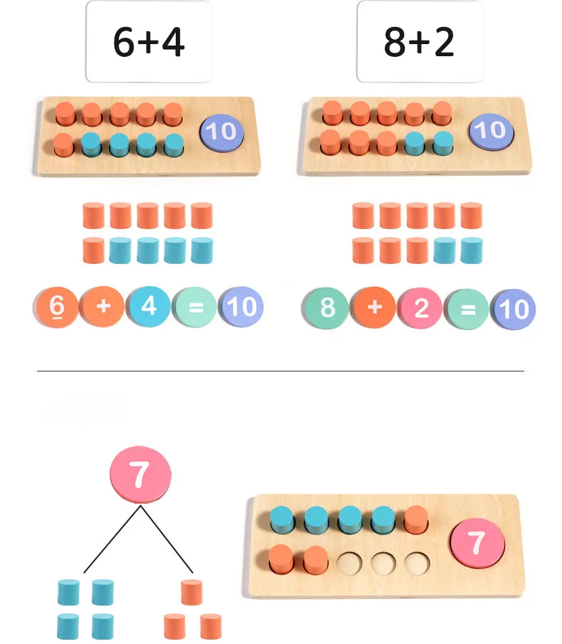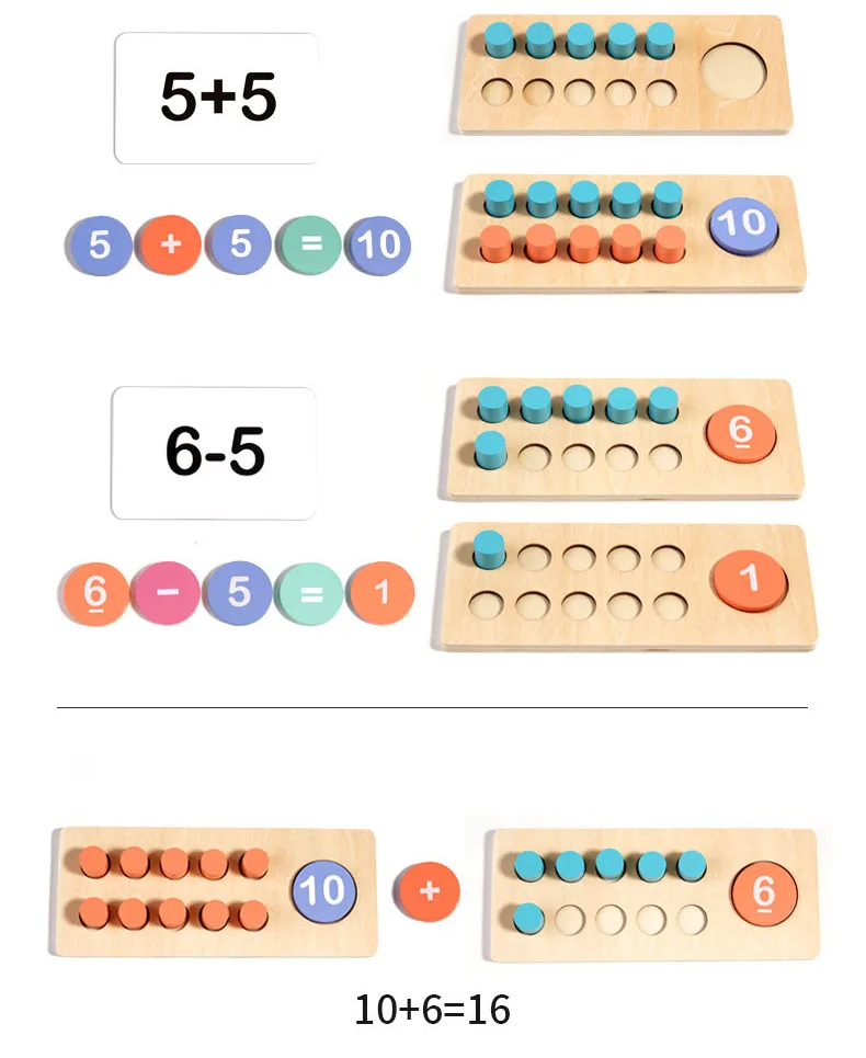Dette træbaserede regnespil giver børn en sjov og engagerende måde at udforske tal, addition og subtraktion på. Med løse skiver, tal og kort lærer børn grundlæggende regnefærdigheder på en visuel og håndgribelig måde.