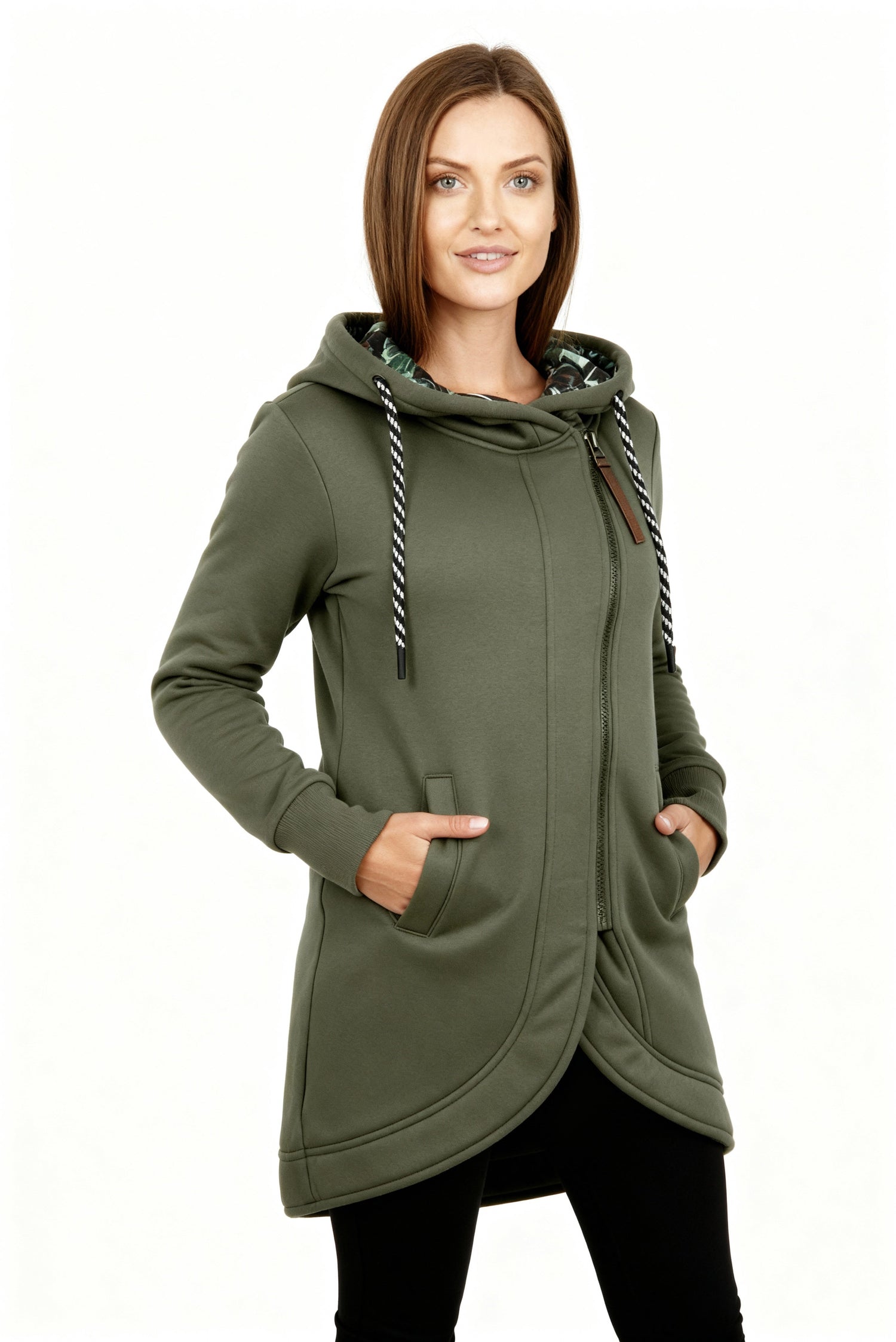 Denne lange damejakke med hætte forener elegance med praktisk komfort. Det unikke wrap-design og de dekorative snøredetaljer giver jakken et moderne og feminint udtryk – perfekt til daglig brug i forår og efterår.